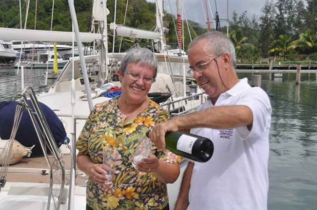 Ya una vez amarrados en el pantalán y con los pies en tierra firme, brindamos con un buen cava Catalán, por el gran acontecimiento, por nuestros familiares y por nuestros grandes amigos que fielmente han seguido nuestro periplo hasta aquí. A todos os damos las gracias por vuestro apoyo.