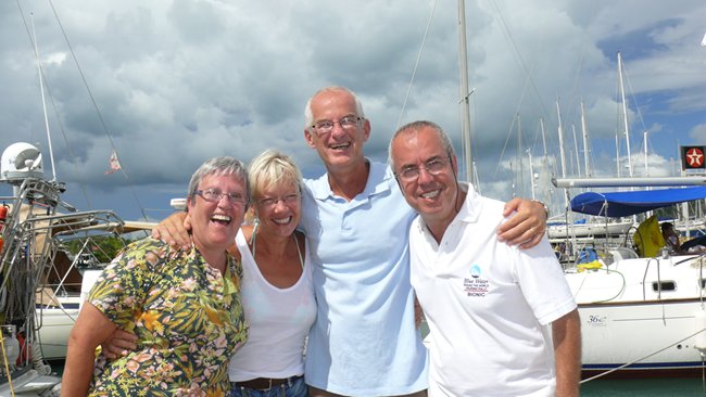 Posando con nuestros amigos suecos, Mónica y Hans que navegan también solos en su catamarán y con los que nos relacionamos mas habitualmente.
