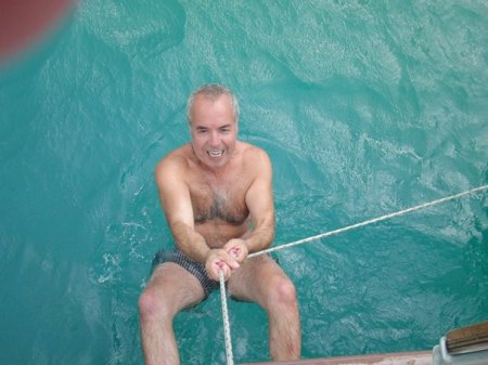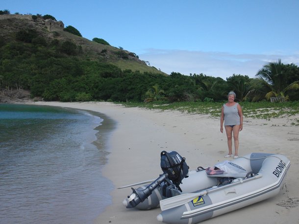 Después de estar balanceándonos sobre el barco toda la noche debido al oleaje existente en el lugar de fondeo, va bien desembarcar y andar un poco por tierra firme. Apenas se ve alguna persona, la arena es límpia inmaculada, así como, el agua de la mar. Como puede verse, la vegetación avanza hasta la misma agua. Los árboles parecen frutales pero no son comestíbles, que se lo pregunten a Pachín que mordió una de las peritas como las conocidas de San Juan y mas tarde le salía fuego por la boca.