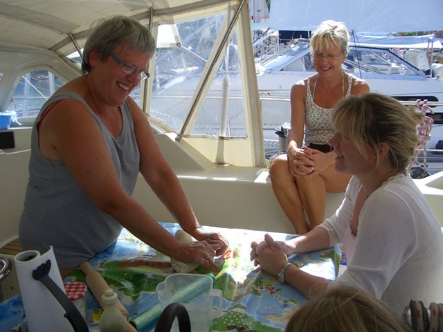 Hoy toca hacer pan y Sheila de la embarcación Miss Tippy se ha ofrecido gentilmente para asesorar a Mónica y Carmen sobre este arte. La verdad es que no ha sido tal difícil. Lo que es seguro es que de este pan no irá ni una miga a la basura aunque se ponga muy duro.