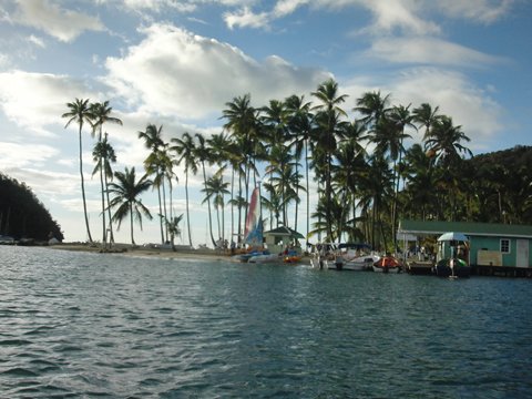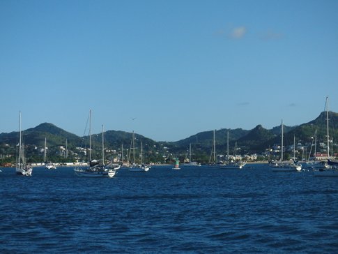 Esta mañana hemos llegado a la bahía de Marigot, al sur de Rodney Bay y en la misma isla de Santa Lucia. Un lugar espectacular donde hemos fondeado con la ayuda de un hooker que hos ha facilitado una boya donde amarrarnos. Se ha cobrado lo suyo y seguidamente han llegado los fruteros que nos han colmado de plátanos. Tenemos el potásio a tope.