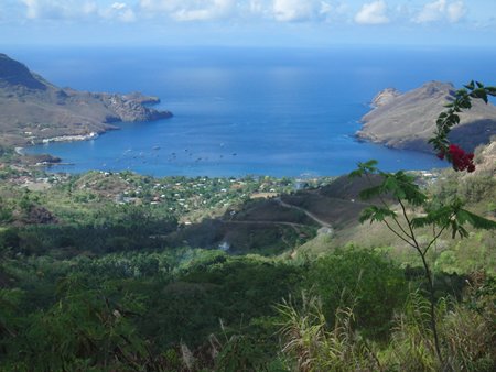 El domingo día 11 de Abril llegamos a la bahía de Taiohae en Nuku-Hiva que podemos ver al fondo y donde pasaremos unos días fondeados, si bien no podemos bañarnos por culpa de los tiburones tigre y martillo que suelen merondear por aqui. Mientras tanto, hacemos alguna que otra excursión anteponiéndo las labores de mantenimiento de la embarcación que no son pocas a medida que vamos acumulando millas.