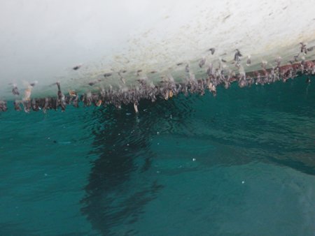 En la popa de la embarcación se acumulan durante la travesía una especie de moluscos parecidos al percebe que se adhieren como lapas y que hay que eliminar. Es curioso que puedan adherirse estos bichos mientras la embarcación navega a una velocidad media de 7 nudos.