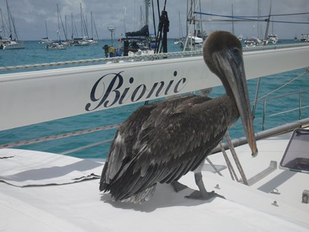 Hay quien presiente que nos vamos y se apresura a coger sitio en el Bionic para poder navegar gratis a las Marquesas. Como siempre en estas latitudes, estos pelicanos están muy habituados a la presencia humana y dejan que nos acerquemos.