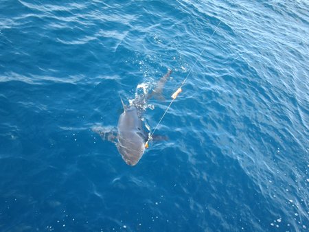 ¡Un tiburón! Esto es lo que hemos pescado, pero ni el ni nosotros estábamos interesados en su presencia a bordo. Después de más de una hora de trasiegos, conseguimos traerlo hasta nosotros, sacó la cabeza y nos estuvo observando durante unos segundos con su ojo izquierdo, seguidamente dio un brinco retorciéndose asimismo y consiguiendo de esta manera arrancar el mosquetón que sujetaba el señuelo con el extremo del sedal. El animalito de aproximadamente 1,8 metros se marchó con nuestro señuelo en la boca y nos dejó pasmados.