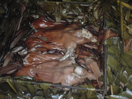 Fiesta Hima, cerdo cocido debajo tierra con hojas de plátano