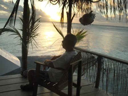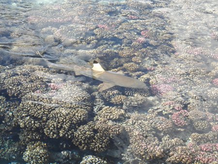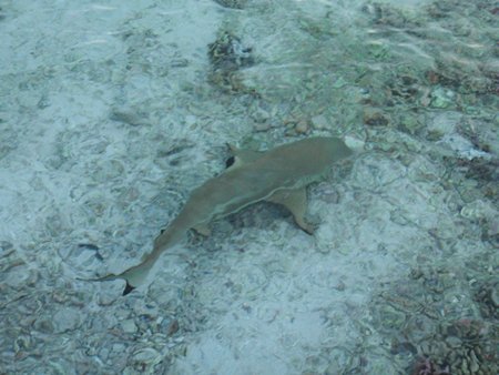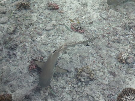 Hemos estado nadando y buceando en un área repleta de varias especies de peces de colores y tiburones de aleta negra que nos han dicho que son inofensivos. Ha sido una experiencia fantástica, al igual que si hubiéramos estado dentro de un acuario.