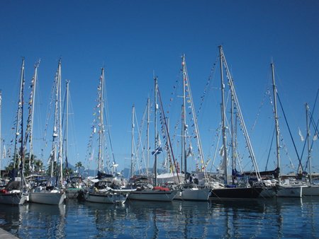 Llegamos a Papeete cuando son las 7 de la mañana del lunes día 10 y nos aproximamos a la bocana del puerto a la vez que solicitamos permiso para entrar. Ha sido una noche de máxima atención ya que la mayor parte de embarcaciones tenían prevista su llegada a la misma hora y además había numerosas boyas de pescadores en la zona con el consiguiente riesgo para nosotros.