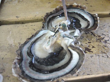 Aprovechando nuestra visita a la plantación de vainilla, realizamos una visita a una de la granjas de perlas negras. donde realizan el injerto del núcleo que posteriormente de cubrirá de naca del color deseado. El periodo de producción de una de estas perlas de tamaño medio está sobre unos tres años. Hay granjas que tienen 500.000 ostras en producción.