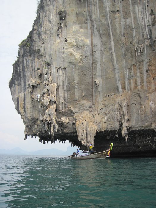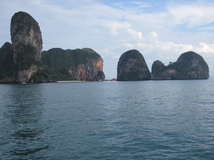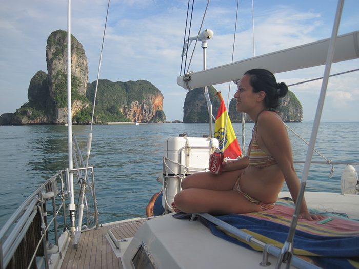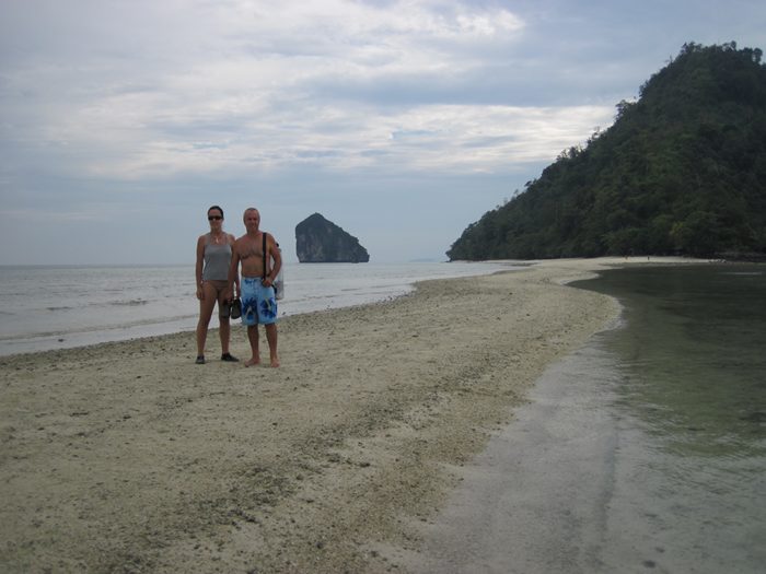 Después de dejar la marina de Haven, hemos fondeado frente a la isla de Koh Dam Khwan que es uno de los islotes del grupo Koh Dam frente a Krabi. Lugar espectacular, especialmente por las formas caprichosas de sus islotes, algunos de ellos unidos por brazos de arena inmaculada donde se puede caminar durante la bajamar. Bajo el agua, peces de colores y cantidades inmensas de coral de formas diversas.