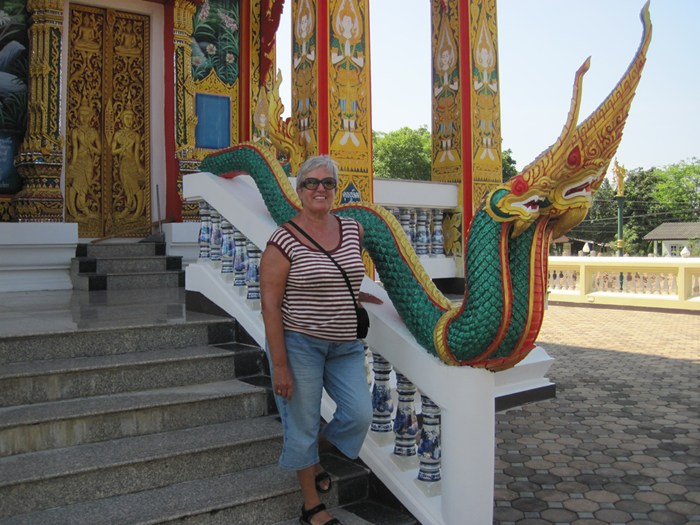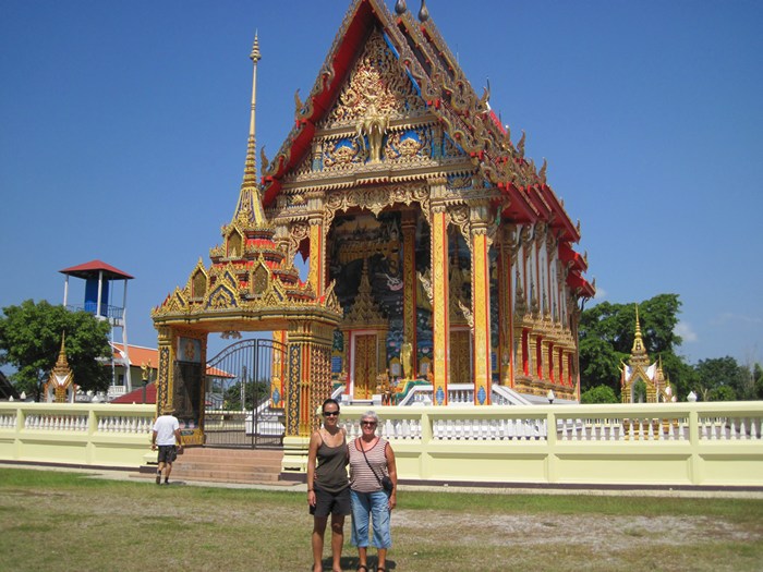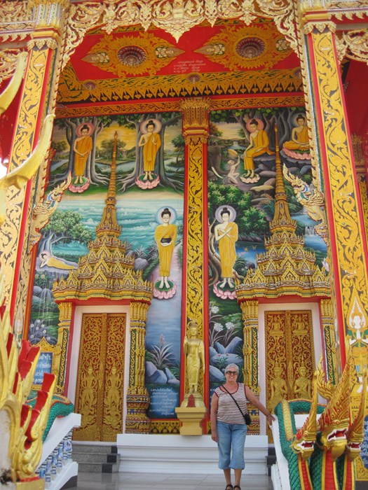 En nuestro desplazamiento desde la Royal Phuket Marina a la bahía de Kamala, de repente nos encontramos con uno de los templos justo a pié de carretera. La parada merece la pena, ya que la fachada está esplendorosa tanto por sus pinturas como por sus dorados de pan de oro.