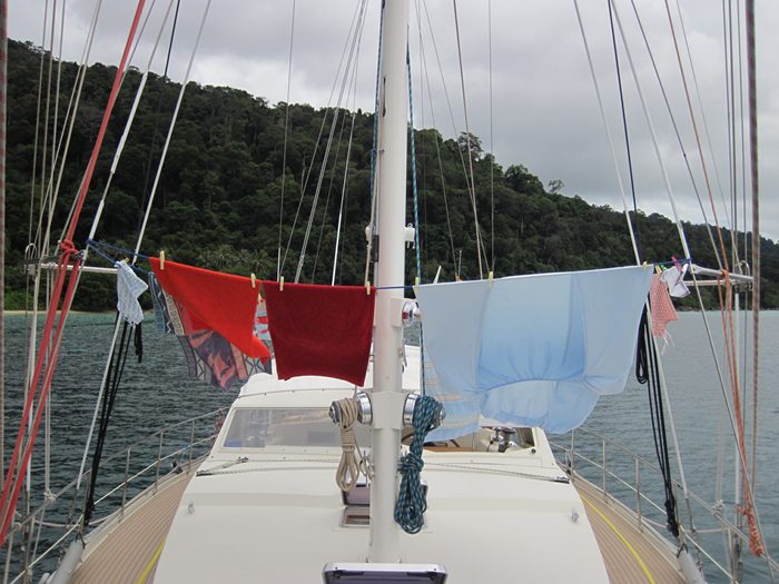 Obviamente, de vez en cuando toca hacer la colada y dado que estamos ahora fondeados en un lugar apartado y solitario, es el mejor momento para hacerlo, dándole un tono poético al paisaje.