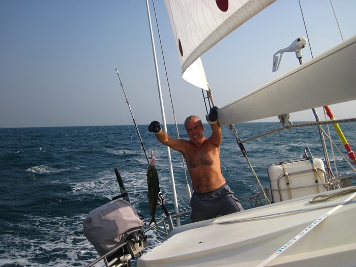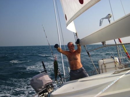 A lo largo de nuestra travesía nos encontramos con cientos de embarcaciones de pesca que rastrean y rastrean los fondos marinos, Aún así, de vez en cuando se les escapa algo y dado que empiezan a escasear las provisiones, este dorado nos va de perlas. Ha ido al horno directamente y nos hemos deleitado con un plato magistral durante la cena.