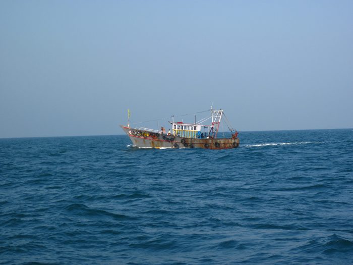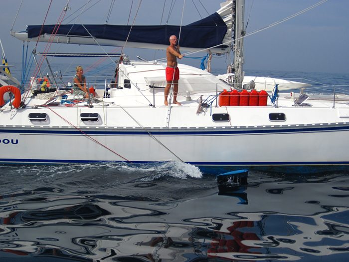 Durante la travesía de Sri Lanka a Cochín tuvimos que apoyar a la embarcación de nuestros amigos suecos, Natibou, que había sufrido un incidente en su embarcación al desprenderse una de las tablas centrales que utilizan como orza, quedando esta colgando peligrosamente y golpeando contra el casco con riesgo de fracturarlo.