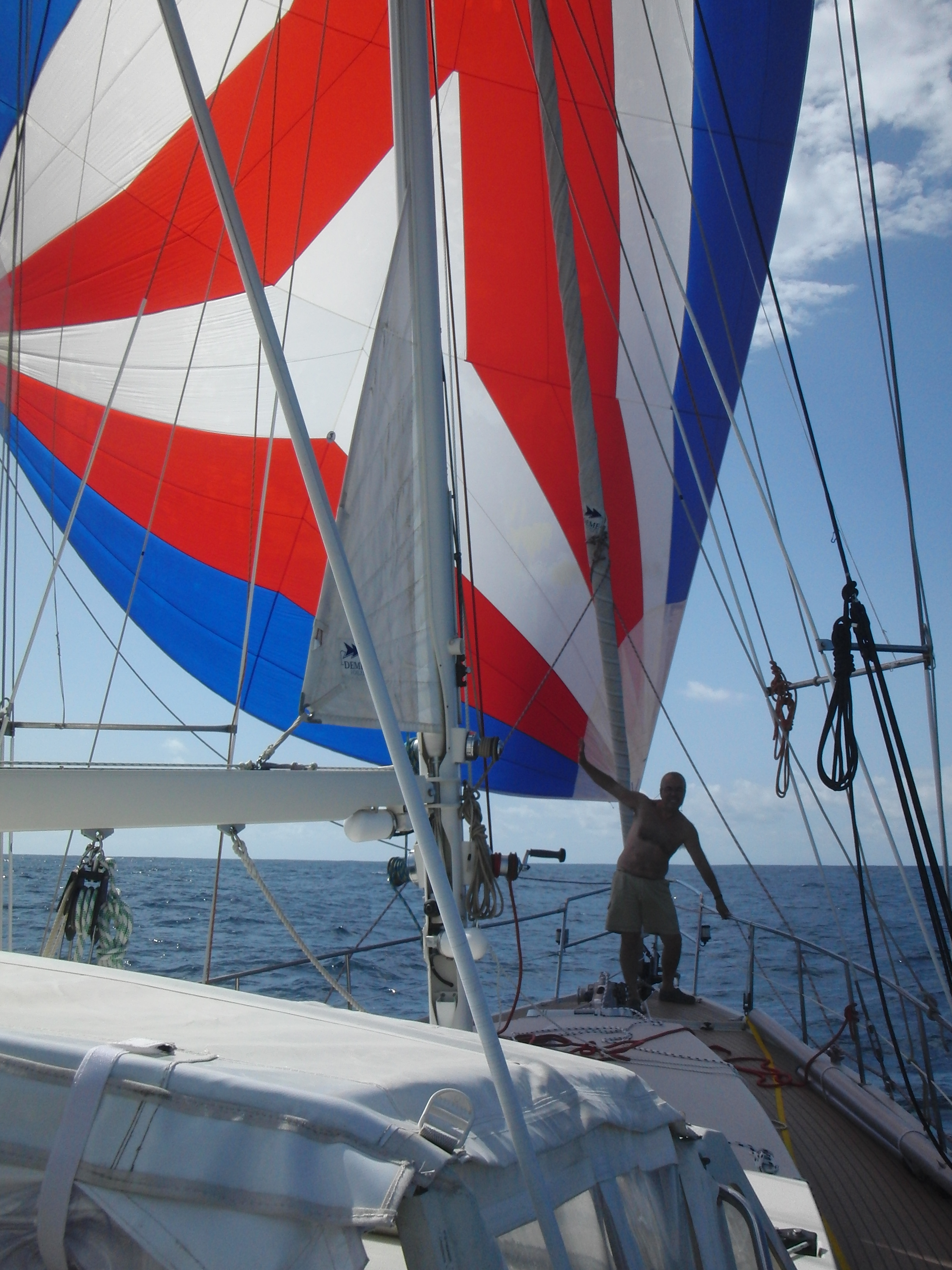 Después de casi cuatro días de navegación en busca de viento para cruzar el charco, finalmente ha llegado a la hora e intensidad programa según la previsión obtenida 24 horas antes. Durante estos días nos hemos visto obligados a navegar mucho a motor, casi un 70%, ya que la existencia de viento era prácticamente nula durante la mayor parte del tiempo. Ayer tuvimos ocasión de navegar un buen rato con el spi asimétrico y fue una gozada.