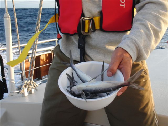 La travesía está siendo bastante placentera sin incidencias que destacar a lo largo de mas de dos semanas que llevamos desde que salimos de Lanzarote. Respecto a la pesca, hemos detectado que el problema está en que no usamos las artes adecuadas, ya que los peces se nos han comido hasta 5 señuelos, un rollo de sedal y finalmente lo peor ha sido hoy en que a punto estábamos de recoger un pez bastante gordo cuando de un tirón ha roto la caña y se ha llevado, señuelo, caña y carrete con sedal. Esperamos recomponer nuestro equipo de pesca cuando lleguemos a Antigua y estar preparados para la siguiente travesía. De momento a lo único que llegamos es a los peces voladores, de los cuales ya nos hemos hartado.