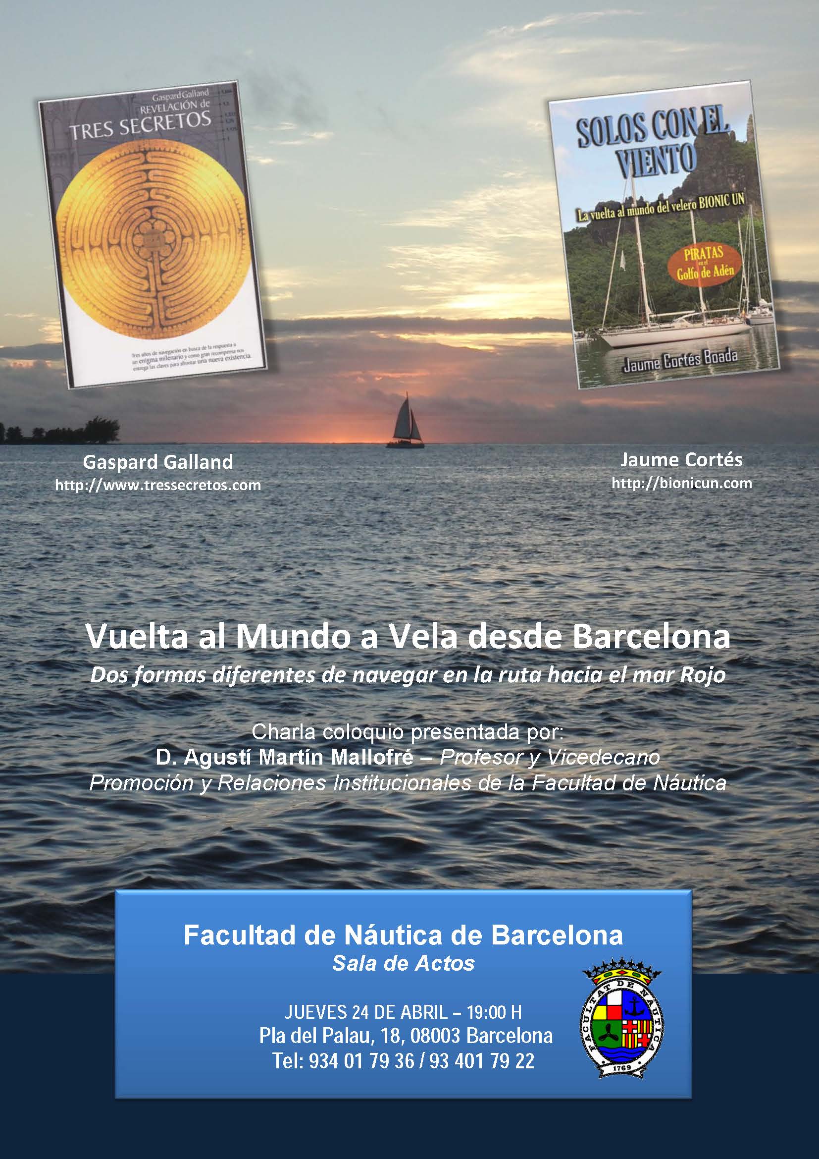 El próximo 24 de Abril a las 19 horas tendrá lugar en la Sala de Actos de la Facultad de Náutica de Barcelona, una charla coloquio sobre La Vuelta al Mundo en Velero desde Barcelona, “Dos formas diferentes de navegar en la ruta hacia el mar Rojo”. A cargo de D.Gaspard Galland, autor del libro “Revelación de tres Secretos” y de D.Jaume Cortés, autor del libro “Solos con el Viento”.